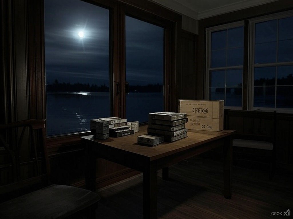 The group bundled up against the cold, stepping outside into the biting night air. The box on the front porch of the lake house, the beam of their flashlights cutting through the darkness. Every creak of the wood underfoot sent shivers down their spines.